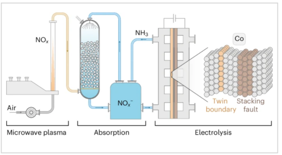 杨贵东教授团队通过“晶界工程”策略,成功开发出一种富含孪晶界(TBs)和堆垛层错(SFs)的改性钴阴极(TB/SF-Co),用于高效选择性电催化还原亚硝酸根(NO₂⁻)。理论分析表明,TBs和SFs缺陷能够上移Co的d带中心,从而增强对NO₂⁻的吸附并促进中间体的加氢过程。该催化剂在NO₂⁻转化为NH₃的过程中,实现了-1.73 A cm⁻²的高分电流密度和96.7%的法拉第效率。进一步将该高性能阴极与微波等离子体空气活化模块(MPAA)耦合,构建了MPAA–ENitR串联系统,实现了从空气到氨的高效合成(图1)。该系统在总电流超过101 A(100 cm²并联电解槽)的条件下,空气到NO₂⁻产率达到0.745 mol h⁻¹,NO₂⁻到NH₃产率达到0.619 mol h⁻¹,法拉第效率超过95%,性能达到或超越了当前国际同类研究的先进水平。