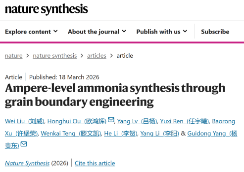 近日,西安交通大学杨贵东教授团队在空气-水合成氨领域取得关键突破,成功构建了一个集成了微波等离子体活化与放大MEA电催化的串联氨合成平台,实现了在安培级电流密度下从空气和水直接合成氨。这项工作不仅为绿色、分布式、模块化氨生产开辟了一条可行的技术路径,也为未来利用可再生能源驱动大宗化学品的可持续合成提供了重要的科学依据和技术范式。相关成果以《通过晶界工程实现安培级氨的合成》(Ampere-level ammonia synthesis through grain boundary engineering) 为题,在国际权威期刊《自然合成》(nature synthesis)在线发表。